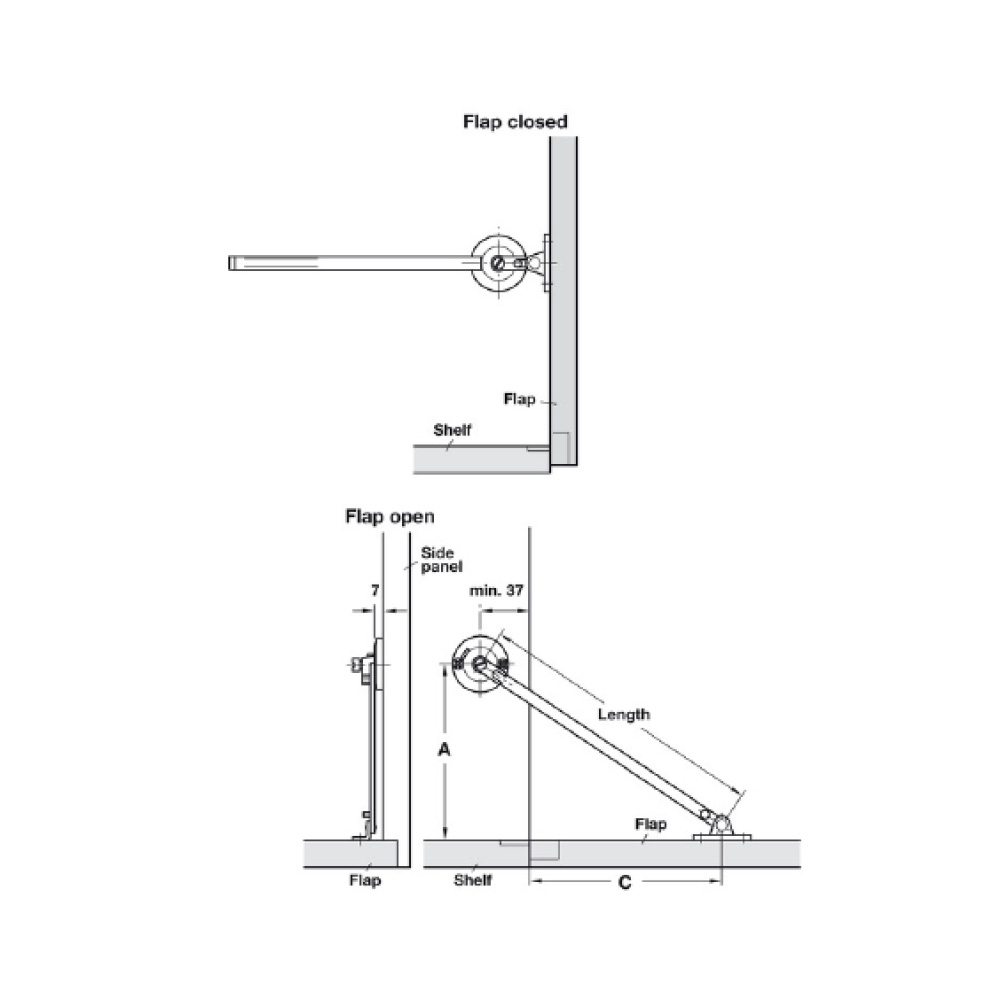 Nickel-plated steel flap stay with plastic housing.