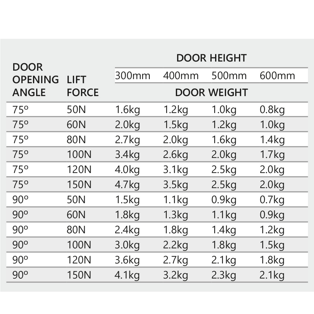 Suitable for lid opening angles of 75 or 90 degrees (dependant on door dimensions - see table).